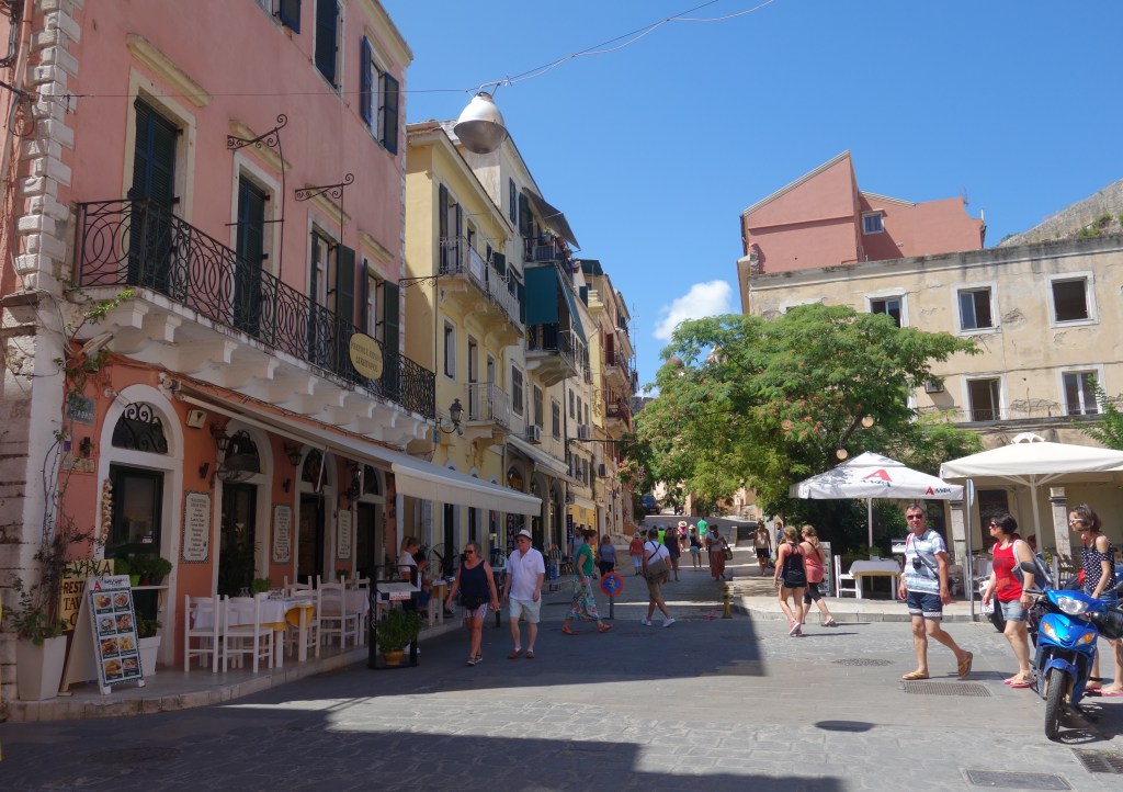 La ville de Corfou (capitale de l’île de Corfou) est une très jolie ville qu’il fait bon de visiter. Evidemment c’est un endroit parfait pour faire un peu de shopping et déguster une petite salle Grecque, mais c’est aussi une ville très jolie parce que c’est ancien et avec énormément de couleurs. (cela me rappelle d’ailleurs un peu l’Italie, mais cela vient sans doute de la domination vénitienne).