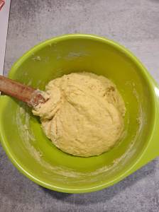 Mélanger jusqu’à obtenir une pâte homogène. Si jamais la pâte colle toujours au saladier, ajouter un peu de farine et mélanger encore. Puis, faire reposer la pâte durant 2 heures.
